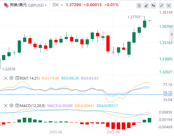 英镑:截止发稿,英镑/美元徘徊于1.3729附近。英镑/美元周四上涨,连续第四天强劲上涨,并在1.3770附近突破44个月高点。美元的广泛抛售支撑了美元的主要相对货币,帮助英镑创下近四年来的最高出价。技术面上,突破1.3750水平将为测试下一个阻力位开辟道路,该阻力位位于1.3815–1.3835范围内。