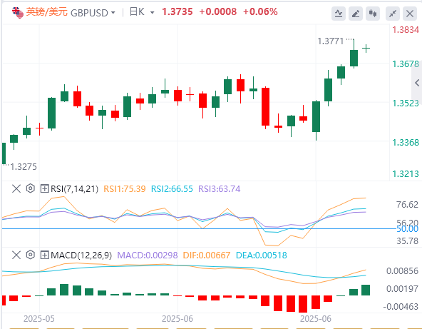 英镑/美元在周四创下三年多来的最高单日收盘价后,在1.3750下方窄幅横盘整理。