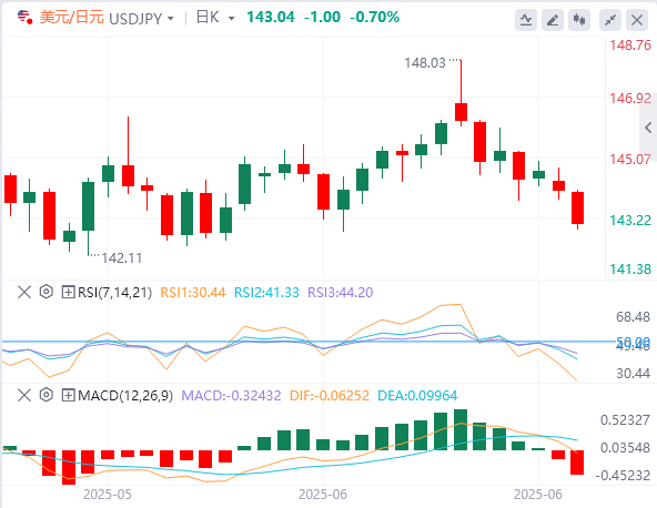 在周一小幅下跌后,美元/日元积聚看跌势头,周二欧洲早盘跌破143.50下跌约0.5%。