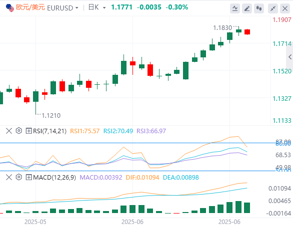 欧元/美元周二触及多年新高1.1830,但回吐了部分日涨幅,收盘小幅走高。周三早些时候,该货币对保持低迷状态,交易价格低于1.1800。欧元区数据显示,失业率从4月份的6.2%小幅上升至5月份的6.3%。