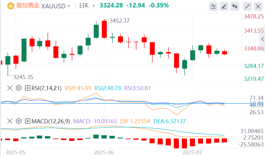 技术面:从技术面来看,黄金价格目前处于高位盘整状态。8月黄金期货价格在3340美元附近,接近4月高点3539.30美元与5月低点3151美元的中点区域。短期内,金价在3250美元至3476.30美元之间波动,显示出横盘整理的特征。黄金多头需要新的基本面刺激以突破当前交易区间。散户投资者的看涨情绪(59%预计金价上涨)为市场注入了一定信心,但短期内金价可能继续在高位震荡,等待新的催化剂。