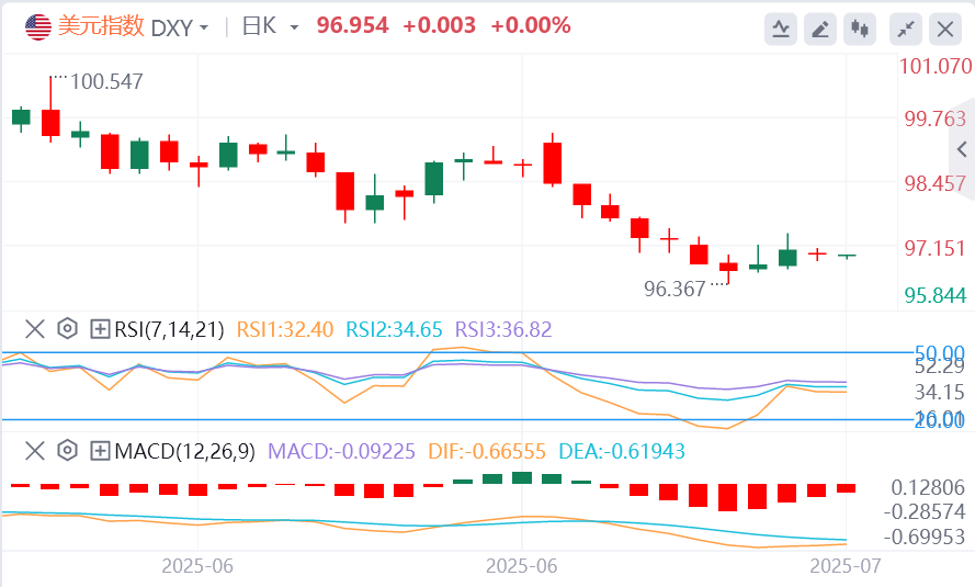 7月7日,北京时间周一亚市早盘,美元指数徘徊在96.95附近。上周五,因特朗普力推的“大而美法案”成功闯关众议院,美元指数有所回落,并在97关口附近来回震荡,最终收跌0.07%,报96.93。现货黄金震荡上行,盘中一度重回3340美元,但未能企稳在这一关口上方,最终收涨0.35%,收报3337.22美元/盎司;现货白银最终收涨0.25%,报36.93美元/盎司。因市场预计欧佩克+将再次增产,两油有所下跌。WTI原油在欧盘时段急速下跌,并一度至65.24美元的日内低点,最终收跌1.07%,报65.62美元/桶;布伦特原油收跌0.62%,报68.14美元/桶。