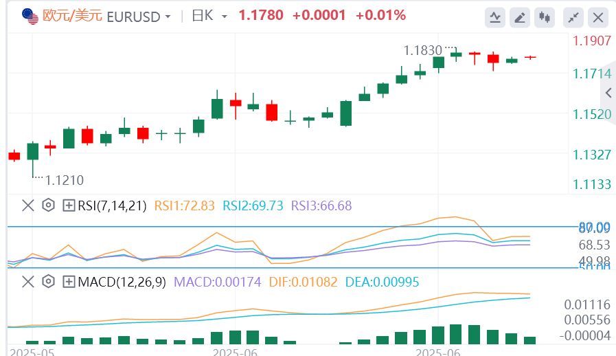 美元指数:截止发稿,美元指数徘徊在96.95附近。美元指数的走势受到多重基本面因素的推动。首先,特朗普关税言论持续发酵,市场对全球贸易前景的担忧加剧。本周美联储将公布上次FOMC会议纪要,市场高度关注其是否释放出未来可能降息的信号。分析师指出,若纪要偏鸽,表明决策者对经济前景持谨慎态度,美元可能面临回调压力;反之,若强调维持高利率的必要性,则有望提振美元走强。尽管美国下周宏观数据有限,但此前6月非农就业数据强劲,失业率下降,为美元提供一定支撑。技术面上,美元指数最近试图摆脱年度低点,但在50MA附近面临阻力。如果美元指数攀升至97.15的50MA上方,它将向下一个阻力位98.00–98.20移动。