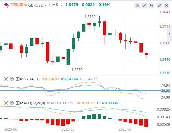 英镑/美元在1.3450附近守住较低位置,延续了从多年高点的修正,因为对风险敏感的英镑兑美元进一步下跌。