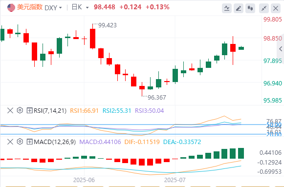 美元指数:截止发稿,美元指数徘徊在98.44附近美元在周三大幅下跌,此前CBS报道称美国总统唐纳德·特朗普询问一组众议院共和党人他是否应该解雇美联储主席杰罗姆·鲍威尔。该消息抵消了之前因6月美国生产者价格指数(PPI)数据低于预期而引发的涨幅,该数据最初在生产者通胀放缓的迹象下提振了美元。技术面上,如果美元指数成功回到98.70水平上方,它将朝着最近的阻力位99.20–99.40前进。
