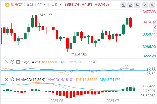 周四亚盘,黄金徘徊在3391.74附近。周三黄金市场经历了一场“过山车”行情。金价在亚市早盘一度冲高至五周高点3438美元/盎司,但随后快速回落,单日跌幅超过1%,最终收于3386.99美元/盎司,较日内高点下跌逾50美元。这一剧烈波动背后,是美欧关税协议进展、风险资产回暖以及美联储政策不确定性等多重因素的共振。本交易日将迎来欧美国家7月PMI数据、美国初请失业金人数变动、美国6月新屋销售总数年化和欧洲央行利率决议,投资者需要予以关注。