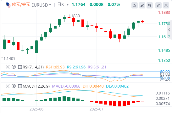 人们普遍预计欧洲央行将在7月会议后维持关键利率不变。欧洲央行行长克里斯蒂娜·拉加德将在格林威治标准时间12:45开始的会前会议上就政策前景发表讲话。欧元/美元在周三小幅上涨后仍处于1.1750上方的盘整阶段。