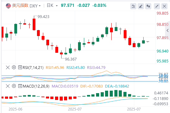 7月28日,北京时间周一亚市早盘,美元指数徘徊在97.57附近。上周五,美元指数连续第二日反弹,最终收涨0.219%,报97.66,但周线仍然收阴。美债收益率涨跌不一,基准的10年期美债收益率收报4.392%,2年期美债收益率收报3.94%。由于美欧贸易谈判取得进展的迹象打压避险需求,现货黄金连跌三日,创一周新低,最终收跌0.92%,收报3337.18美元/盎司,抹去周内全部涨幅;现货白银美盘跳水,一度跌破38关口,尾盘小幅回升,最终收跌2.39%,报38.17美元/盎司。一些负面经济消息和供应增加的预期导致国际油价回落,但对国际贸易协议可能提振全球经济增长和未来石油需求的乐观情绪限制了跌幅。WTI原油跌至逾三周低点,最终收跌1.67%,报64.85美元/桶;布伦特原油收跌1.41%,报67.6美元/桶。