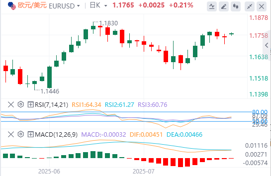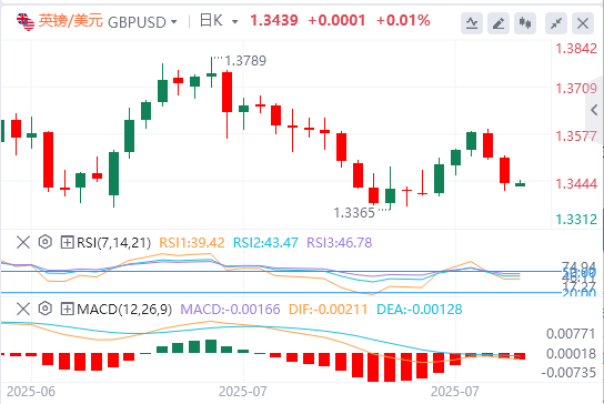 欧元:截止发稿,欧元/美元徘徊在1.1765附近。欧洲央行周四如预期维持利率在2%不变,并释出对经济展望偏乐观的信号,加上欧盟与美国接近达成贸易协议,令市场重新评估今年再度降息的可能性。技术面上,欧元/美元最近的支撑位位于1.1675–1.1690区间。跌破1.1675水平将推动欧元/美元走向下一个支撑位1.1575–1.1590。