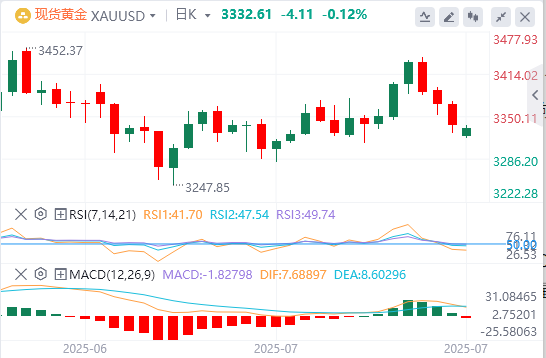 周一亚盘,黄金徘徊在3332.61附近。黄金市场上周波动剧烈,金价在本周前两个交易日飙升,但随后金价大幅下挫,连续三个交易日走软,最终金价本周收盘下滑。分析师指出,特朗普贸易谈判方面传来积极进展,市场风险偏好情绪回升,这打击了黄金的避险需求。