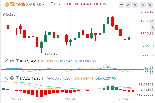 周三亚盘,黄金徘徊在3330.80附近。。这一反弹行情发生在周一金价暴跌至3302美元附近(7月9日以来最低点)之后,显示出市场情绪的快速切换。这种剧烈波动背后,是多重关键因素的角力:美联储利率决议在即、中美贸易谈判进入关键阶段、全球避险情绪起伏不定。