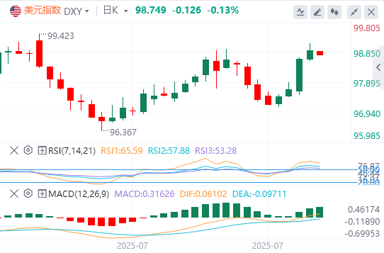 技术面:从黄金日线图来看,布林带走势显示出明显的横盘整理格局。布林带中轨位于3338美元附近,而价格当前处于布林中轨下方运行,反映出短线偏弱态势。布林上轨在3402美元附近构成关键阻力,而下轨则在3274美元附近提供支撑,价格区间被有效限制。分析认为若下破3270美元关口,则可能打开更大下行空间。MACD指标方面,快线(DIFF)维持在2.77,而慢线(DEA)为7.22,双线继续在零轴附近收敛。MACD柱状图处于负值区间,当前为-8.90,显示空头动能仍未明显减弱。分析认为若短期无法实现金叉,金价仍将延续低位震荡。RSI指标目前报45.27,处于中性偏弱区域,表明买盘力量有限。若RSI进一步跌破40,则意味着卖压可能加速,短期或测试前期低点3120美元一线。整体来看分析认为,金价自2956美元低点一路反弹至3499美元高位,但在冲击3451美元后动能逐步衰竭,目前处于典型的震荡回调阶段,技术上偏向空头。