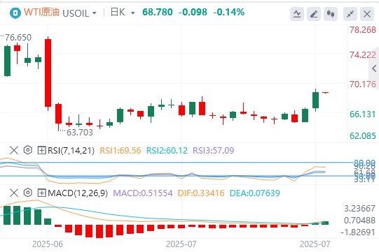 周三亚盘,原油交投68.78附近。油价周二上涨超过3%,因美国总统特朗普就乌克兰战争向俄罗斯施加更大压力,以及对美国与其主要贸易伙伴之间的贸易战正在减弱持乐观态度。支撑油价的还有美国和欧盟之间的贸易协定,虽然对大多数欧盟商品征收15%的进口关税,但避免了两个主要盟国之间全面爆发贸易战,因为贸易战将波及近三分之一的全球贸易,并使燃料需求前景黯淡。对于投资者而言,未来24小时需要重点关注:美联储政策声明对9月降息可能性的暗示、鲍威尔记者会对经济前景的评估、中美贸易谈判后续进展。此外,本交易日还需关注日本央行利率决议和加拿大央行利率决议、美国二季度GDP系列数据和美国7月ADP就业数据,德国和欧元区二季度GDP数据也需要予以留意。