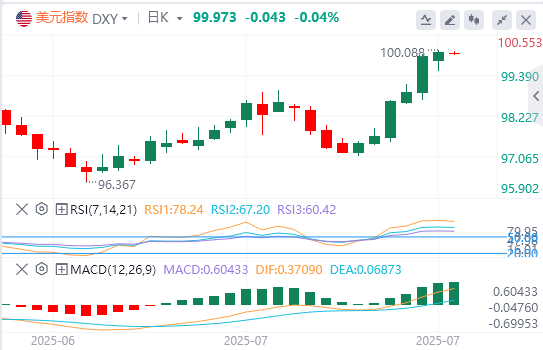 8月1日,北京时间周五亚市早盘,美元指数徘徊在99.97附近。周四,美元指数在美联储最爱的通胀指标意外回升后短线拉升,2个月来首次站上100整数关口,最终收涨0.11%,报100.03,为连续第六个交易日上涨,并实现了2025年来首次月度上涨。美债收益率涨跌不一,基准的10年期美债收益率收报4.375%,2年期美债收益率收报3.963%。由于市场避险情绪在特朗普关税大限前不确定性仍存的情况下回温,现货黄金反弹,一度重回3310美元关口,但在PCE数据公布后收窄日内涨幅,最终收涨0.46%,收报3290.24美元/盎司;现货白银继续走低,最终收跌1.12%,报36.71美元/盎司。国际原油止步三连跌。WTI原油美盘一度逼近68美元关口,最终收跌1.29%,报68.92美元/桶;布伦特原油最终收跌1.25%,报71.69美元/桶。