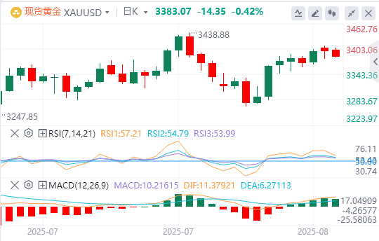 周一亚盘,黄金徘徊在3383.07附近。上周五现货黄金窄幅震荡,收报3397.13美元/盎司,接近收平,关税政策的不确定性、美联储降息预期的升温,仍给金价提供支撑。不过美国期金却上演冲高回落行情。本周将迎来美国7月CPI数据,市场关注度非常高,投资者需要重点关注,调查显示,多数分析师和散户倾向于看涨黄金后市。