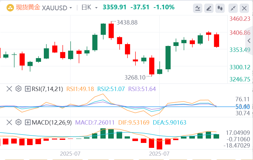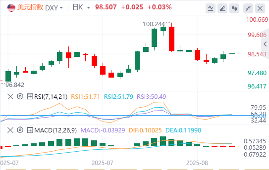 8月12日,北京时间周二亚市早盘,美元指数徘徊在98.50附近。周一,美元指数小幅走高,并在美盘时段一度涨至98.65的日内高点,最终收涨0.23%,报98.46;美债收益率微涨,基准的10年期美债收益率收报4.289%,2年期美债收益率收报3.783%。因美国总统特朗普表示不会对进口金条征收关税,现货黄金日内重挫近60美元,并一度跌至3340美元关口附近,最终收跌1.61%,收报3342.73美元/盎司;现货白银收跌1.85%,报37.60美元/盎司。因投资者正等待本周的特朗普-普京会晤,原油有所企稳,终结日线7连跌。WTI原油先跌后涨,而后在63美元附近震荡,最终收涨0.96%,报63.28美元/桶;布伦特原油最终收涨0.84%,报66.26美元/桶。
