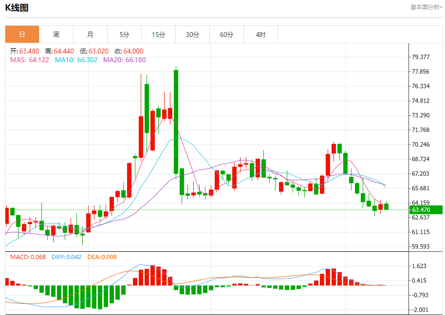 原油市场:截止北京时间20:23,美油下跌,现报63.470,跌幅0.77%。纽市盘前,(原油)价格在最后一盘中交易中谨慎上涨,受到(RSI)出现积极信号的支撑,重新测试63.75美元的关键阻力位,同时在短期基础上触及小幅看跌趋势线,监控价格走势。