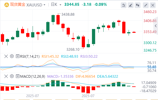 周三亚盘,黄金徘徊在3344.85附近。黄金在多日低点3330美元附近反弹,因市场预期美联储(Fed)将在9月份降息。美联储官员包括奥斯坦·古尔斯比和拉斐尔·博斯蒂克定于周三晚些时候发表讲话。