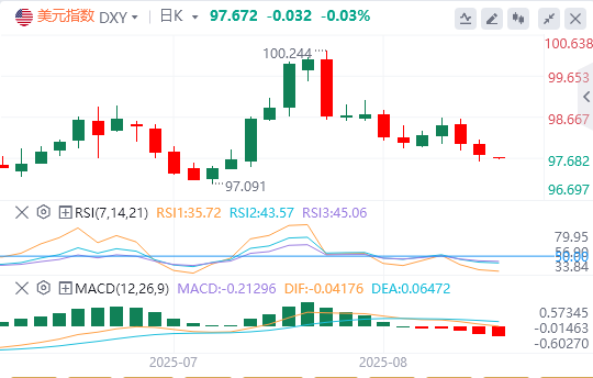 美元指数:截止发稿,美元指数徘徊在97.67美元。周三受疲软的通胀数据以及市场对美联储下月降息预期升温的影响,美元指数(DXY)连续第二个交易日延续跌势。美元指数盘中报97.81,创下7月28日以来的最低收盘价,继周二下跌0.5%后,周三又下跌0.2%。这一走势反映出,随着交易员计入激进的政策宽松预期,看跌情绪有所加剧。技术面上,如果美元指数保持在97.80水平下方,它将走向最近的支撑位,即位于97.10–97.30区间。