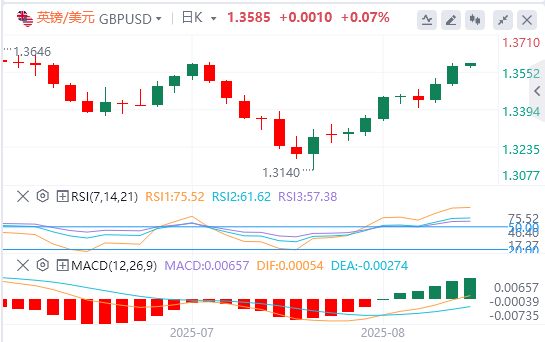 英镑:截止发稿,英镑/美元徘徊在1.3585附近。周三英镑兑美元汇率攀升至1.3570附近。随着市场押注美联储将在9月政策会议上降息导致美元遭遇抛售压力,该货币对延续涨势。周三英镑兑主要货币走强,投资者正等待周四公布的英国第二季度GDP初值数据。与此同时,由于企业社保缴款增加导致的劳动力市场降温也是央行决策者的主要担忧。技术面,突破1.3585水平将为测试位于1.3665–1.3680区间的阻力位打开道路。
