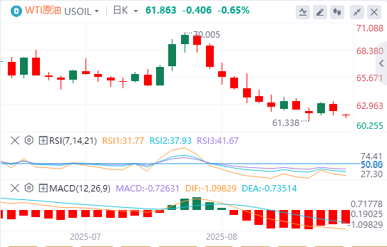 周一亚盘,原油交投61.86附近。随着交易员将注意力转特朗普与泽连斯基在周一举行的会晤,油价下跌。这位乌克兰领导人面临美国的压力,要求他与俄罗斯达成一项涉及割让领土的和平协议。上周五,特朗普暗示他并不急于实施对俄油买家的惩罚措施。