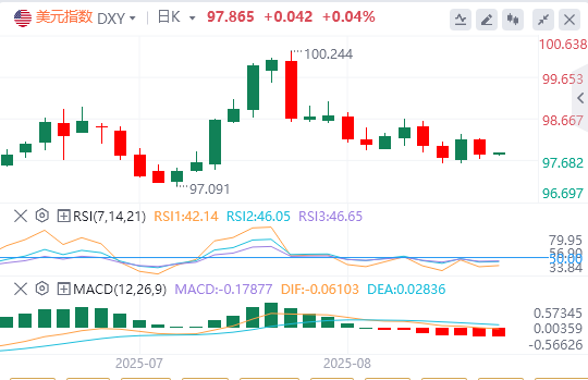 美元指数:截止发稿,美元指数徘徊在98.86美元.上周美元延续了上周的下滑,美元指数跌至两周低点,低于98.00,并延续了从8月份突破关键100.00水平以来的回落。技术面上,跌破97.60将推动美元指数升至位于97.10–97.30区间的支撑位。