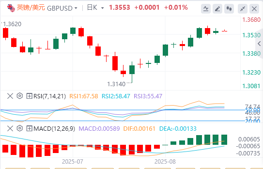 英镑:截止发稿,英镑/美元徘徊在1.3553附近。上周五,英镑兑走软的美元上涨,在乐观的经济数据和英国央行鹰派降息之后,英镑上周走高。英镑尾盘上涨0.2%,报1.35520美元,上周涨幅达到0.7%。技术面,如果英镑/美元成功收于1.3585水平上方,它将走向下一个阻力位,即位于1.3665–1.3680区间。