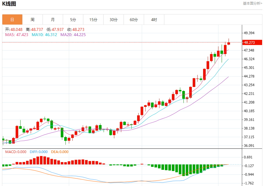现货白银:截止北京时间20:23,现货白银上涨,现报48.271,涨幅0.62%。纽市盘前,(白银)价格在最后一个交易日的盘中水平上飙升,主要看涨趋势在短期基础上占主导地位,其交易沿着支持性的主要和次要趋势线进行,特别是其在EMA50上方交易所代表的动态支持的持续,加强了瞄准新阻力水平的机会,除了相对强度指标上出现积极信号之外,尽管达到了超买水平。