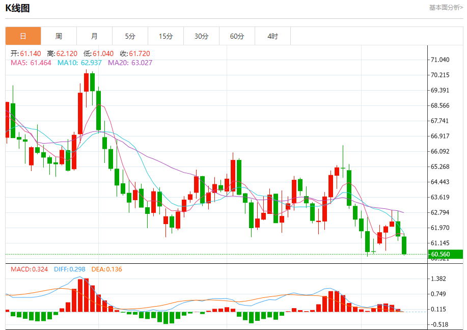 原油市场:截止北京时间20:23,美油下跌,现报60.560,跌幅1.53%。纽市盘前,(原油)价格在最近一个交易日继续下跌,退出了限制其之前短期交易的看涨修正通道的范围,由于其交易低于EMA50而继续承受负面压力,这加剧了负面压力,相对强度指标上出现了负面信号。