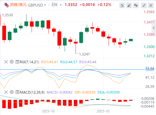 英镑:截至发稿,英镑/美元徘徊在1.3352附近。美联储将于周三发布的利率电话会议,人们普遍预计将再次降息25个基点。经过数月的罢工,美联储终于在上次会议上启动了新的降息计划,市场坚信美联储将在本周连续第二次降息。本周美联储利率决定的关键点将是美联储在12月连续第三次降息的可能性有多大。技术面上,突破1.3350水平将推动英镑/美元走向下一个阻力位1.3485–1.3500。