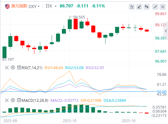 10月28日,北京时间周二亚市早盘,美元指数徘徊在98.70附近。周一,美元指数震荡下行,最终小幅收跌0.13%,报98.81。基准的10年期美债收益率收报3.9790%,对美联储政策利率敏感的2年期美债收益率收报3.4990%。全球贸易冲突的最新进展令避险需求降温,现货黄金大跌近3%,失守3990美元/盎司大关,日内跌超100美元,最终收跌3.17%,报3981.74美元/盎司;现货白银最终收跌3.54%,报46.89美元/盎司。OPEC+倾向于再次小幅增加12月份的石油产量,国际油价收低。WTI原油最终收跌0.15%,报61.37美元/桶;布伦特原油最终收跌0.96%,报65.17美元/桶。