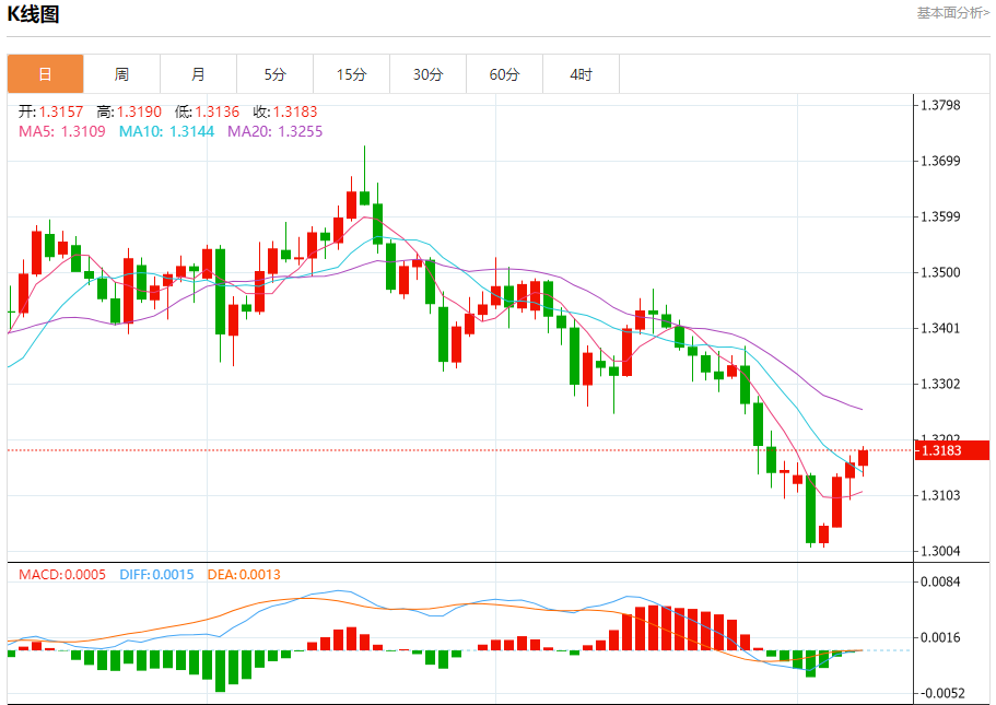 英镑/美元:截止北京时间21:20,英镑/美元上涨,现报1.3184,涨幅0.16%。纽市盘前,(GBPUSD)价格在最后一个交易日下跌,受关键阻力1.3155的稳定性影响,以收集其先前上涨的收益,并试图获得可能有助于突破该阻力的看涨势头,此外还试图卸载相对强度指标上的超买条件,特别是在出现负交叉的情况下。价格依赖于其EMA50的支撑,盘中强势看涨修正波占主导地位。