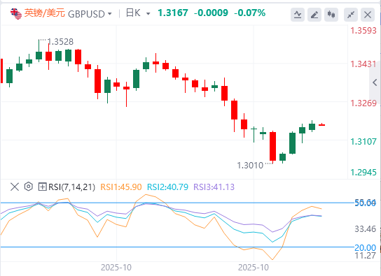 英镑:截至发稿,英镑/美元徘徊在1.3167附近。英镑/美元在周一继续加速,延续至四天的连胜纪录,因为英镑交易员为最新一轮的英国就业数据做好准备。退伍军人节将导致周二美国市场流动性减弱,但市场希望美国可能接近结束历史上最长的政府资金停摆,这应该会保持风险偏好的强劲,并对看涨的美元(USD)流入施加硬性限制。技术面上,RSI处于温和区域,因此短期内有足够的空间获得额外的动力。
