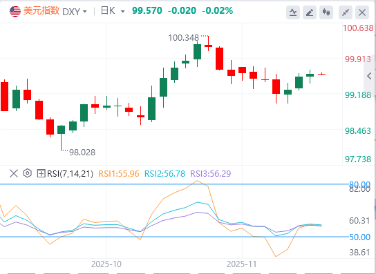 11月19日,北京时间周三亚市早盘,美元指数徘徊在99.57附近。周二,受疲软的美国就业数据拖累,美元指数盘中下挫,但在科技股抛售潮中保持坚挺,最终收涨0.072%,报99.61;美债收益率有所回落,基准的10年期美债收益最终收报4.113%,对美联储政策利率敏感的2年期美债收益率收报3.585%。现货黄金先跌后涨,盘中一度下破4000美元大关,随后迅速反弹,在ADP周度数据公布后进一步回升,最终收涨0.54%,报4067.51美元/盎司;现货白银最终收涨0.96%,报50.69美元/盎司。随着交易员正在权衡西方制裁对俄罗斯石油供应的影响,国际原油震荡走高。WTI原油站上60美元关口,最终收涨1.39%,报60.57美元/桶;布伦特原油最终收涨1.18%,报64.46美元/桶。