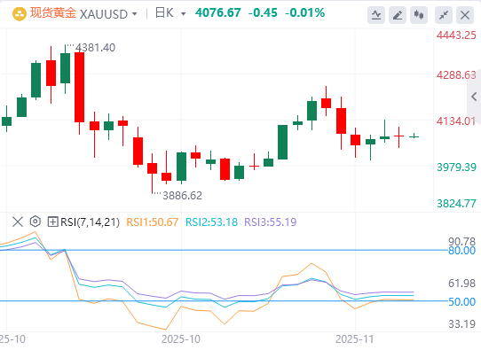 技术面:尽管美联储官员态度转向鹰派,但黄金的上涨趋势依然保持完好。然而,价格走势表明,一旦金价跌破11月18日低点3998美元/盎司,卖方可能占据主导地位,并可能进一步测试50日简单移动平均线(SMA)3954美元/盎司。不过,阻力最小的路径表明,一旦金价突破4100美元/盎司,买盘压力可能会推动金价升向4150美元/盎司,然后再测试上一个周期高点4245美元/盎司,即11月13日的峰值。