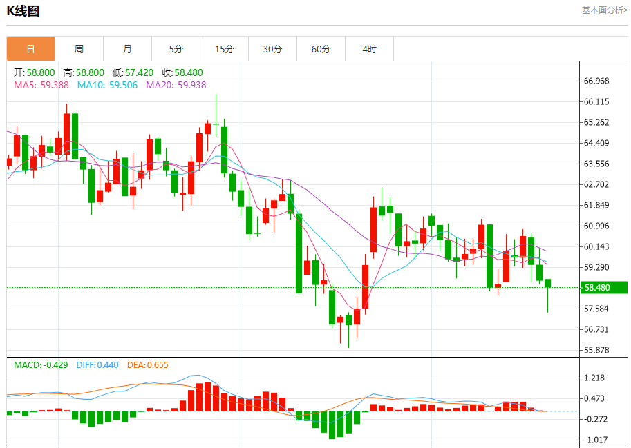 原油市场:截止北京时间21:20,美油下跌,现报58.430,跌幅0.95%。纽市盘前,由于短期内主要的看跌趋势占主导,加上价格在50日均线下方交易所带来的持续下行压力,以及相对强弱指标出现的负面信号,尽管已达到超卖水平,(原油)的价格在最后一次盘中交易中下滑,跌破了关键支撑位58.00美元。