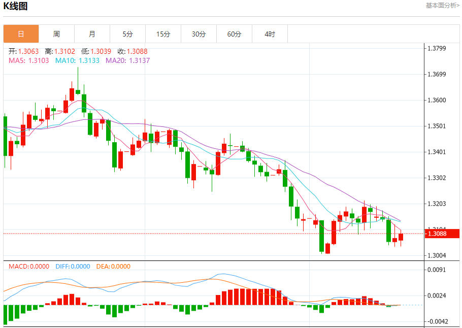 英镑/美元:截止北京时间21:20,英镑/美元上涨,现报1.3088,涨幅0.12%。纽市盘前,(GBPUSD)价格在最后一个交易日小幅上涨,原因是其交易低于EMA50,受到短期基础上形成的负面技术形态(上升楔形形态)的影响,继续承受负面压力,此外,在达到超买水平后,相对强度指标上出现负面信号,相对强度指标上形成负面背离。