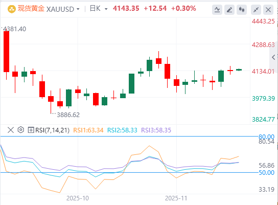 技术面:尽管金价在4200美元/盎司下方盘整,交易员们仍在等待新的催化剂,但黄金价格仍呈现上涨趋势。相对强弱指数(RSI)虽然持平,但仍高于50的阈值,表明买方占据主导地位。金价第一个关键阻力位是4200美元/盎司,其次是11月13日的高点4245美元/盎司。如果突破后者,则可能上探4300美元/盎司,甚至挑战历史高点4381美元/盎司。另一方面,如果跌破4100美元/盎司,则可能挑战20日简单移动平均线(SMA)4045美元/盎司,之后可能进一步下探至4000美元/盎司。