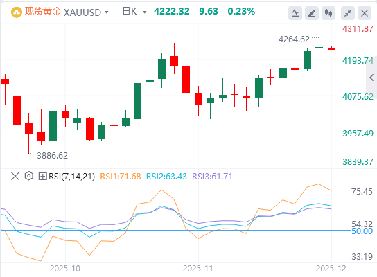 周二亚盘,黄金徘徊在4222.32附近。随着美国美联储(Fed)可能在12月降息的猜测日益加剧,贵金属价格略微上涨。交易员们等待周二晚些时候公布的美国ISM制造业采购经理人指数(PMI)11月报告。