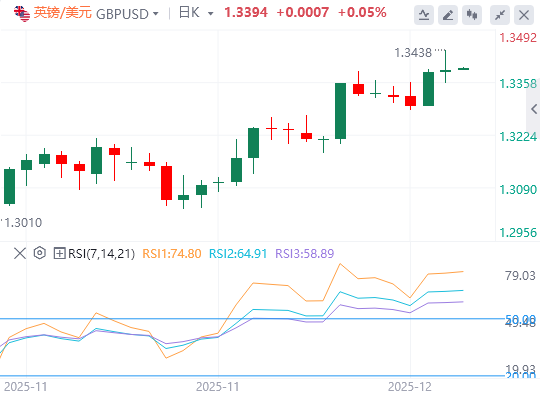 英镑:截至发稿,英镑/美元徘徊在1.3394附近,在美联储连续第三次降息后,英镑市场正逐渐偏向看涨。本周的平静结束让位于下周英国的紧张发行日程。技术面上,英镑/美元突破了1.3360至1.3375的阻力位,正试图在1.3430上方收割。如果这次尝试成功,英镑/美元将向下一个阻力位1.3475–1.3490移动。需要注意的是,RSI最近已进入超卖区间,因此回调风险正在增加。