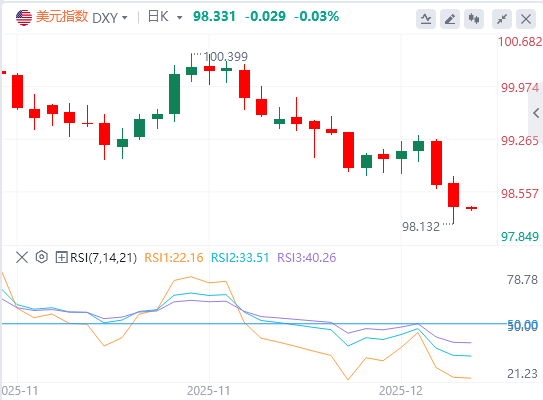 12月12日,北京时间周五亚市早盘,美元指数徘徊在98.33附近。周四,美国就业数据低于预期,美元指数延续下跌趋势,最终收跌0.60%,报98.65;基准的10年期美债收益率最终收报4.1610%,对美联储政策利率敏感的2年期美债收益率收报3.5510%。现货黄金触及逾一个月以来的最高水平,最终收涨1.21%,报4279.89美元/盎司;现货白银续创历史新高,最终收涨3%,报63.57美元/盎司。受乌克兰与俄罗斯潜在和平协议进展的压力影响,国际油价下跌。WTI原油最终收跌1.76%,报57.91美元/桶;布伦特原油最终收跌1.47%,报61.59美元/桶。