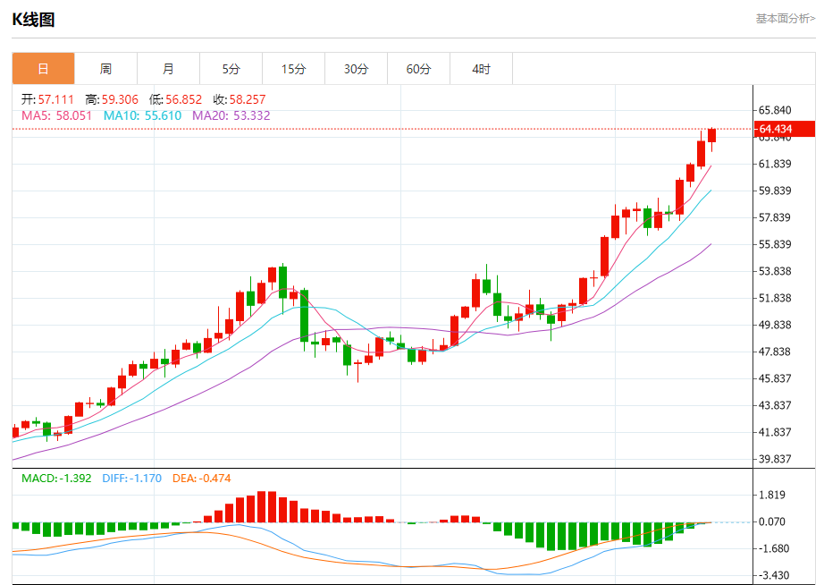 现货白银:截止北京时间21:20,现货白银上涨,现报64.439,涨幅1.39%。纽市盘前,(白银)价格在最后一个交易日继续上涨,利用其在陡峭斜坡上沿小牛市趋势线交易的优势,表明该轨道的主导地位和稳定性,此外,由于其交易高于EMA50而继续产生积极压力,注意到相对强度指标上出现积极信号,尽管达到了超买水平。