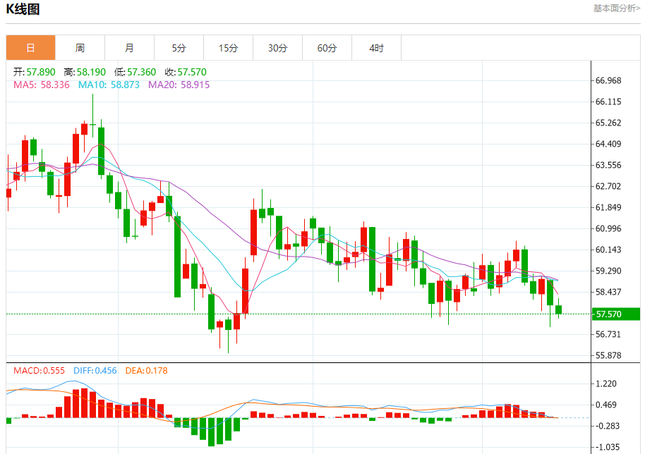 原油市场:截止北京时间21:20,美油下跌,现报57.580,跌幅0.03%。纽市盘前,(原油)的价格在上一次日内交易中下跌,触及关键支撑位57.35美元,这一支撑正是我们今天晨间分析中预期的目标,同时价格在短期内沿着小幅下行趋势线交易,相对强弱指标出现负面信号,在达到超买水平后增加了价格周围的下行压力。