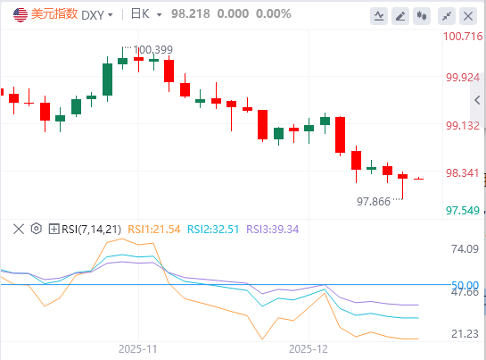 美元指数:截至发稿,美元徘徊在98.21附近。美元在本年度最后阶段开局表现略显疲软,延续上周跌势。此前美联储释放进一步降息信号,同时市场愈发认为,若全球经济持续企稳,其他经济体的央行或将开启加息周期。技术面上,美元指数正试图在支撑位98.00-98.15下方收稳。如果这次尝试成功,美元指数将向下一个支撑位移动,该支撑位位于97.35至97.50区间。5至97.50方向移动。