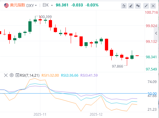 美元指数:截至发稿,美元徘徊在98.36附近。周四的CPI发布情况异常。巴克莱经济学家普贾·斯里拉姆警告说,11月的报告“不太可能被视为通胀的'干净'数据”,因为劳工统计局不会在政府关门43天延迟后单独发布十月数据。市场必须依赖从9月到11月的两个月变化。技术面上,美元指数最近的支撑位位于98.00至98.15区间。成功测试该水平将推动美元指数下一个支撑位97.35至97.50。