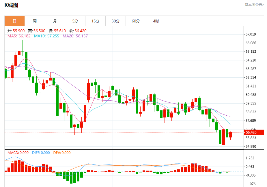原油市场:截止北京时间21:20,美油上涨,现报56.390,涨幅0.71%。纽市盘前,在上一次盘中交易中,(原油)价格上涨,受到相对强弱指标出现积极信号的支持,此前其已达到超卖水平,并在短期内测试了一条陡峭的小型下跌趋势线,同时由于持续受到动态负面压力的影响——表现为价格在EMA50下方交易——降低了近期持续回升的可能性。