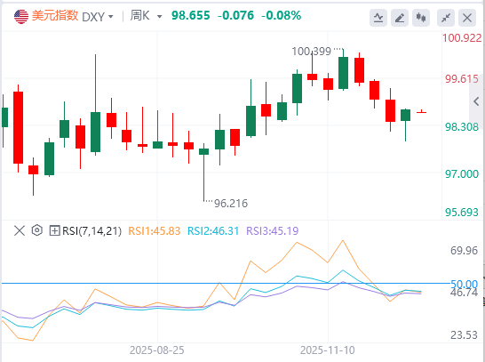 12月22日,北京时间周一亚市早盘,美元指数徘徊在98.65附近。上周五,美元指数震荡上行,盘中一度逼近99关口,最终收涨0.3%,报98.73;基准的10年期美债收益率最终收报4.144%,对美联储政策利率敏感的2年期美债收益率收报3.490%。受美联储降息预期增强的提振,现货黄金盘中一度重回4350美元,但随后回吐部分涨幅,最终收涨0.15%,报4338.60美元/盎司;现货白银再创历史新高,最终收涨2.55%,报67.11美元/盎司。因美国拦截委内瑞拉油轮可能给市场造成干扰,投资者也正等待俄乌可能达成和平协议的消息,原油有所反弹。WTI原油在美盘前快速上涨,最终收涨1.12%,报56.48美元/桶;布伦特原油最终收涨1.27%,报60.65美元/桶。