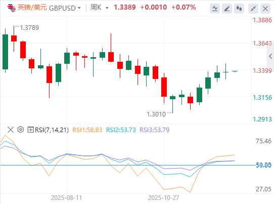 欧元:截至发稿,欧元/美元徘徊在1.1712附近。欧元/美元走强,此前欧洲央行(ECB)维持政策利率不变,并对欧元区经济持更积极态度,该经济对全球贸易冲击表现出韧性。随着交易者在长假期前实现盈利,金融市场可能依然低迷。技术面上,尽管欧元/美元近期涨势有所放缓,但整体看涨格局未改。移动平均线呈多头排列、短期上升趋势保持完好,且价格走势形成清晰的“高点抬升、低点上移”形态,多重信号均指向多头方向,现阶段难以构建看空逻辑。