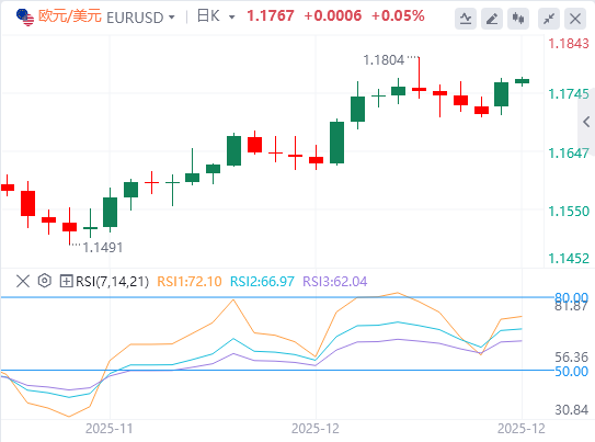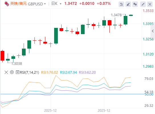 英镑:截至发稿,英镑/美元徘徊在1.3472附近。英镑/美元在周一找到了高位空间,开启了一个假期缩短的交易周,伴随着美元疲软的最新波动,推动英镑(GBP)达到十周来的最高买盘。英镑交易者在很大程度上对英国央行(BoE)最新的降息置之不理,因为英国央行的政策战略使得降息观察者的前景变得模糊不清。技术面上,价格保持在前支撑区1.3350–1.3370美元,上升的50日均线为近期动态支撑。100日均线近1.3285美元继续支撑中期多头结构。近期蜡烛波动性减弱,显示盘整而非趋势疲劳。