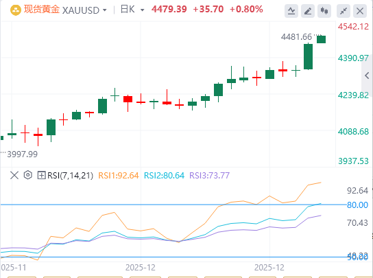 周二亚盘,黄金徘徊在4479.39附近。受地缘政治紧张局势加剧与市场预期美国2026年进一步降息的共同推动,黄金与白银价格大幅飙升,双双创下历史新高。